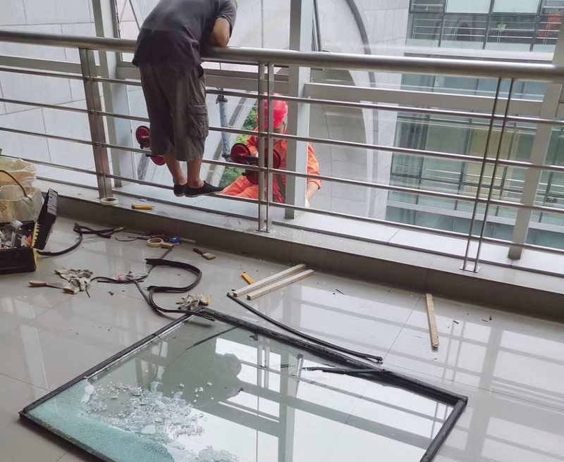 成都高新技术产业开发区人民法院高空外墙玻璃坏了进行更换,成都洁尔亮清洁公司提供服务。